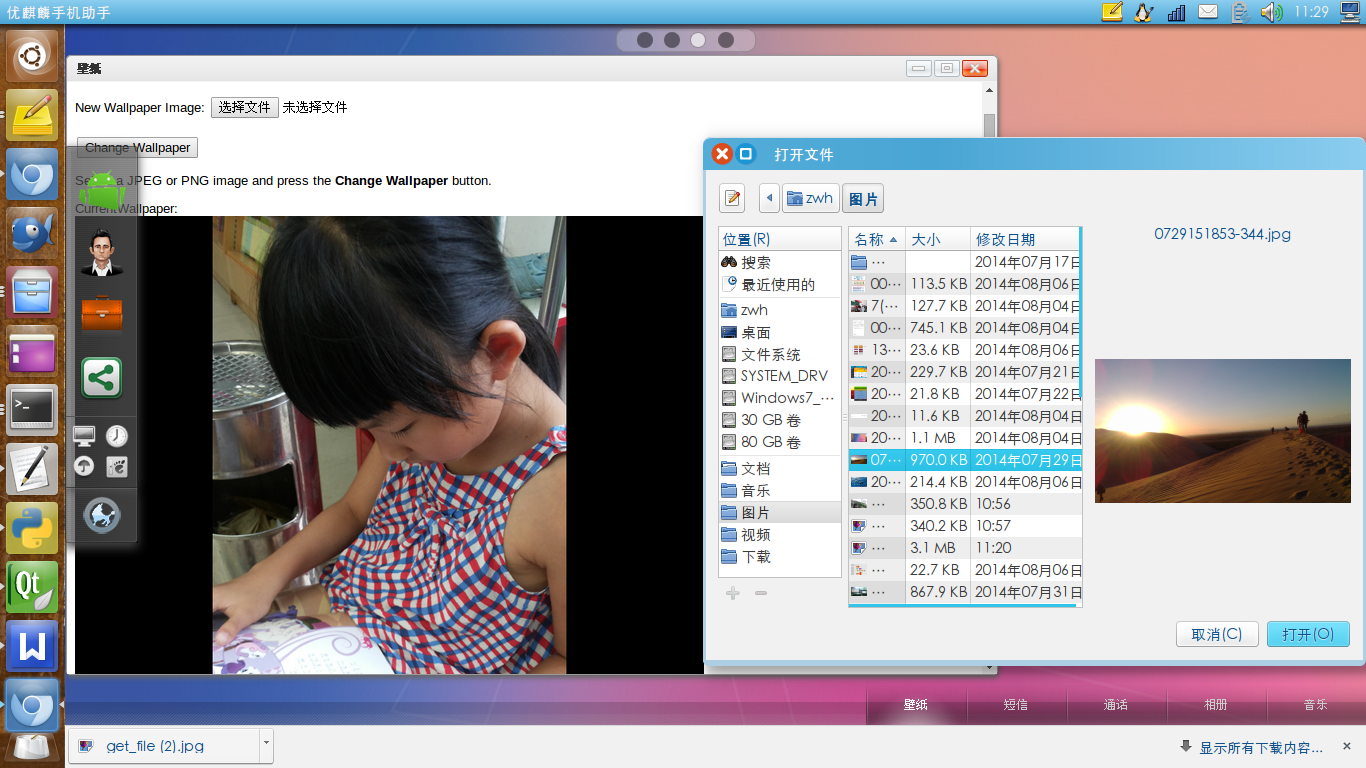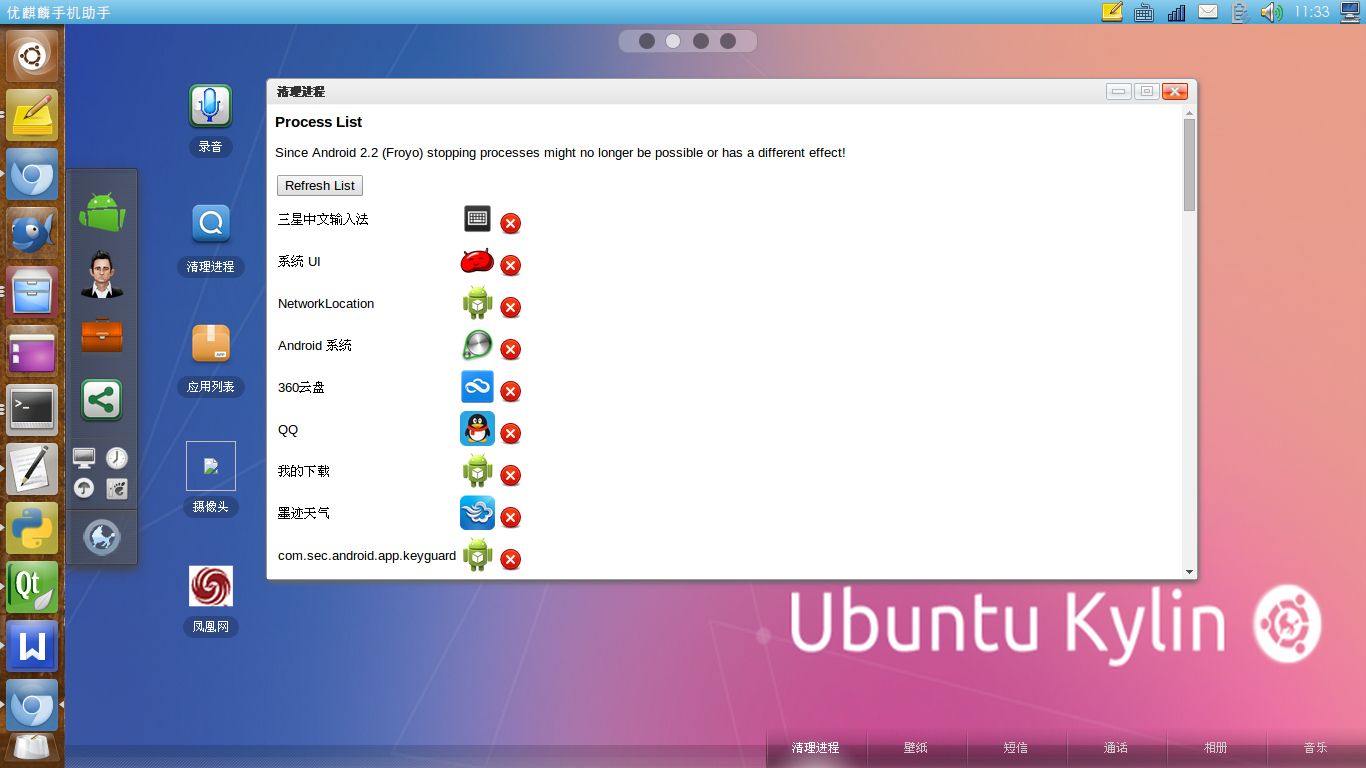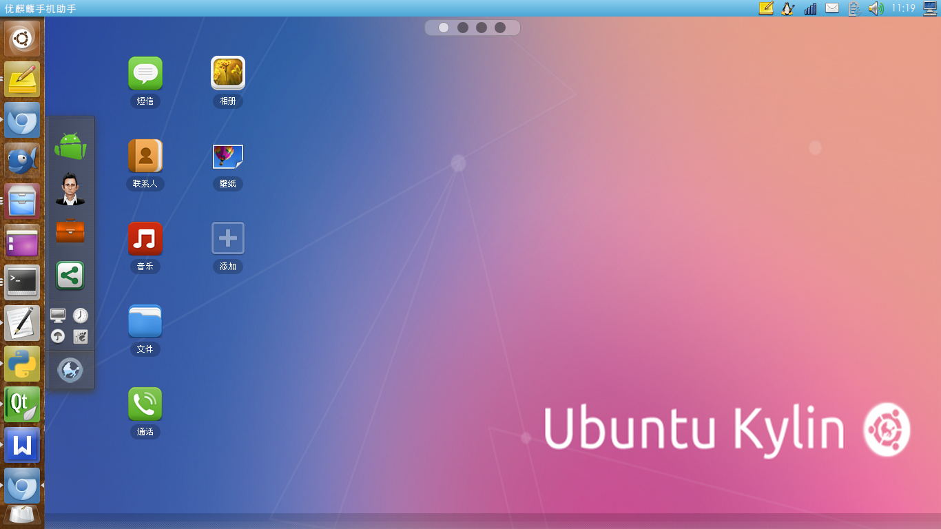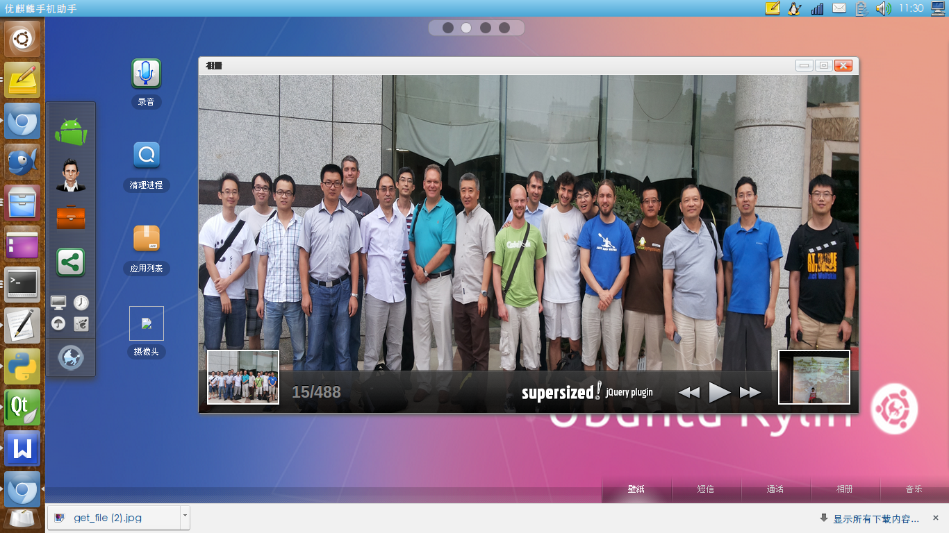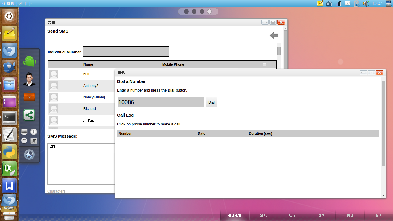 接下來我們就可以真正開始體驗(yàn)優(yōu)麒麟手機(jī)助手的功能啦。如下圖,鵬宇同學(xué)目前實(shí)現(xiàn)的還是瀏覽器桌面操作方式,后續(xù)將會(huì)運(yùn)用最新的Ubuntu SDK將其改造為具有本地應(yīng)用特性的類Web APP模式。通過試用我們可以驚喜地發(fā)現(xiàn),該版本已經(jīng)具有音樂播放、相冊(cè)展示、壁紙?jiān)O(shè)置、進(jìn)程清理、通訊錄、文件上傳/下載等諸多功能。等等,少點(diǎn)什么?——當(dāng)然,還有必不可少的發(fā)送短信和撥打電話功能!
