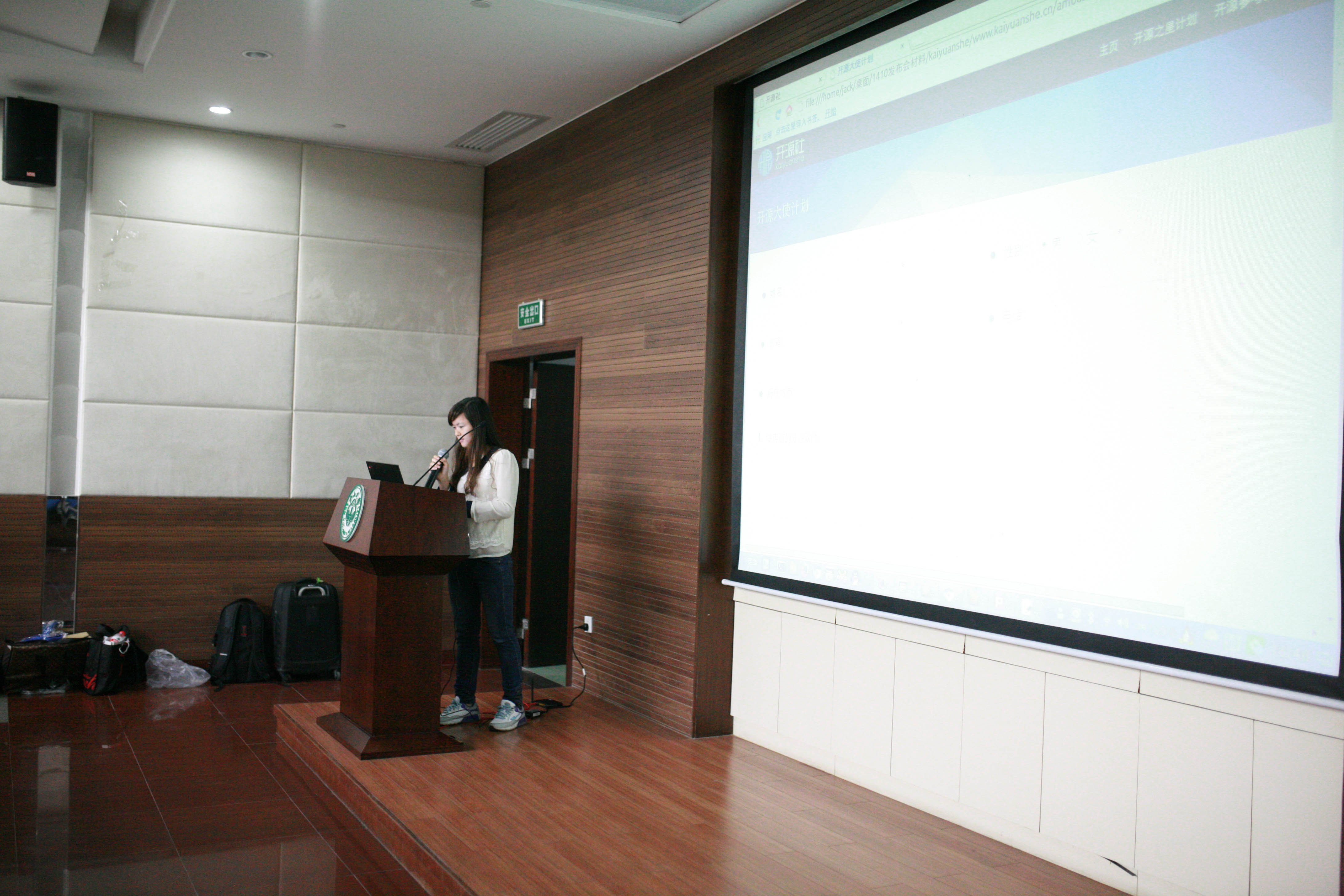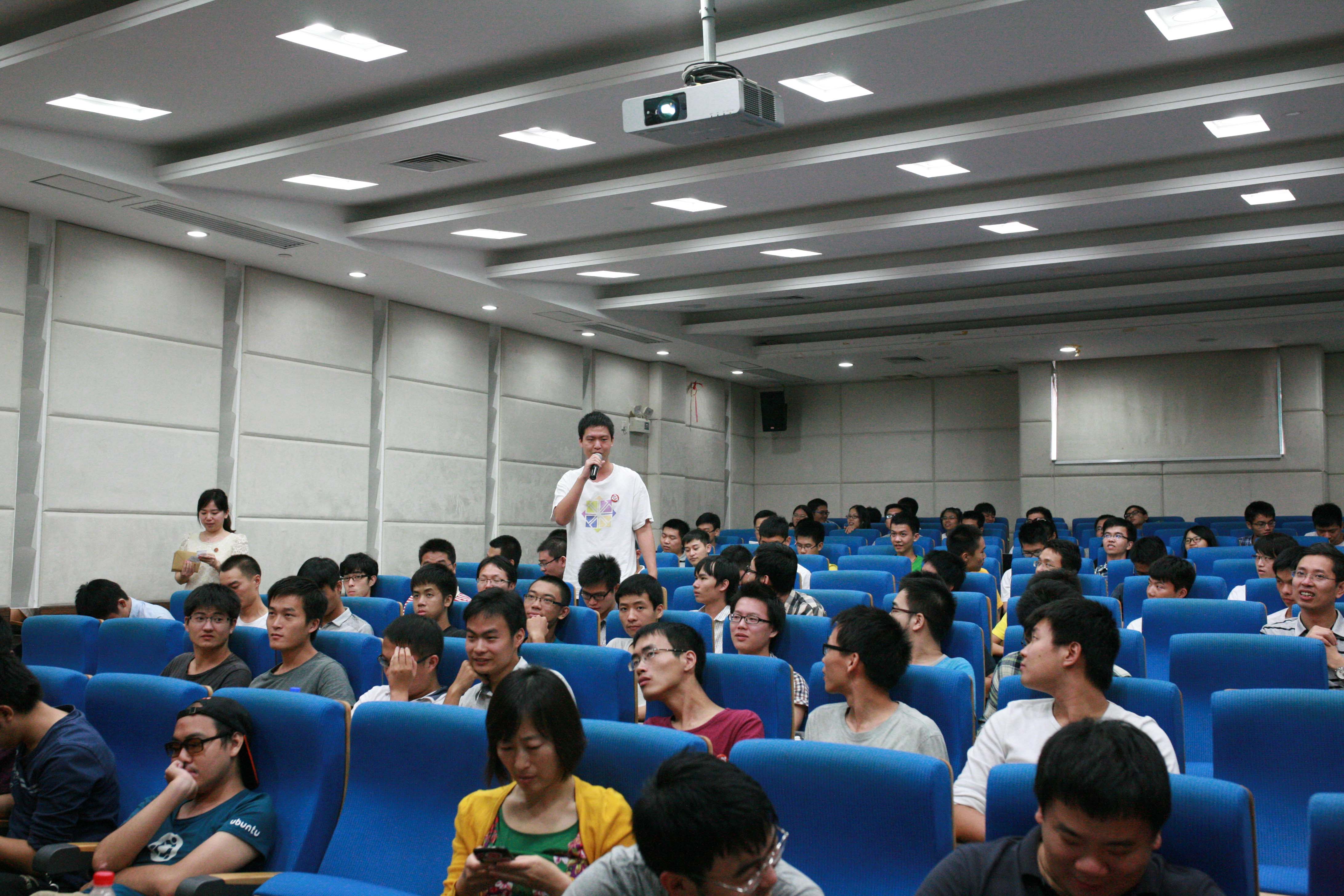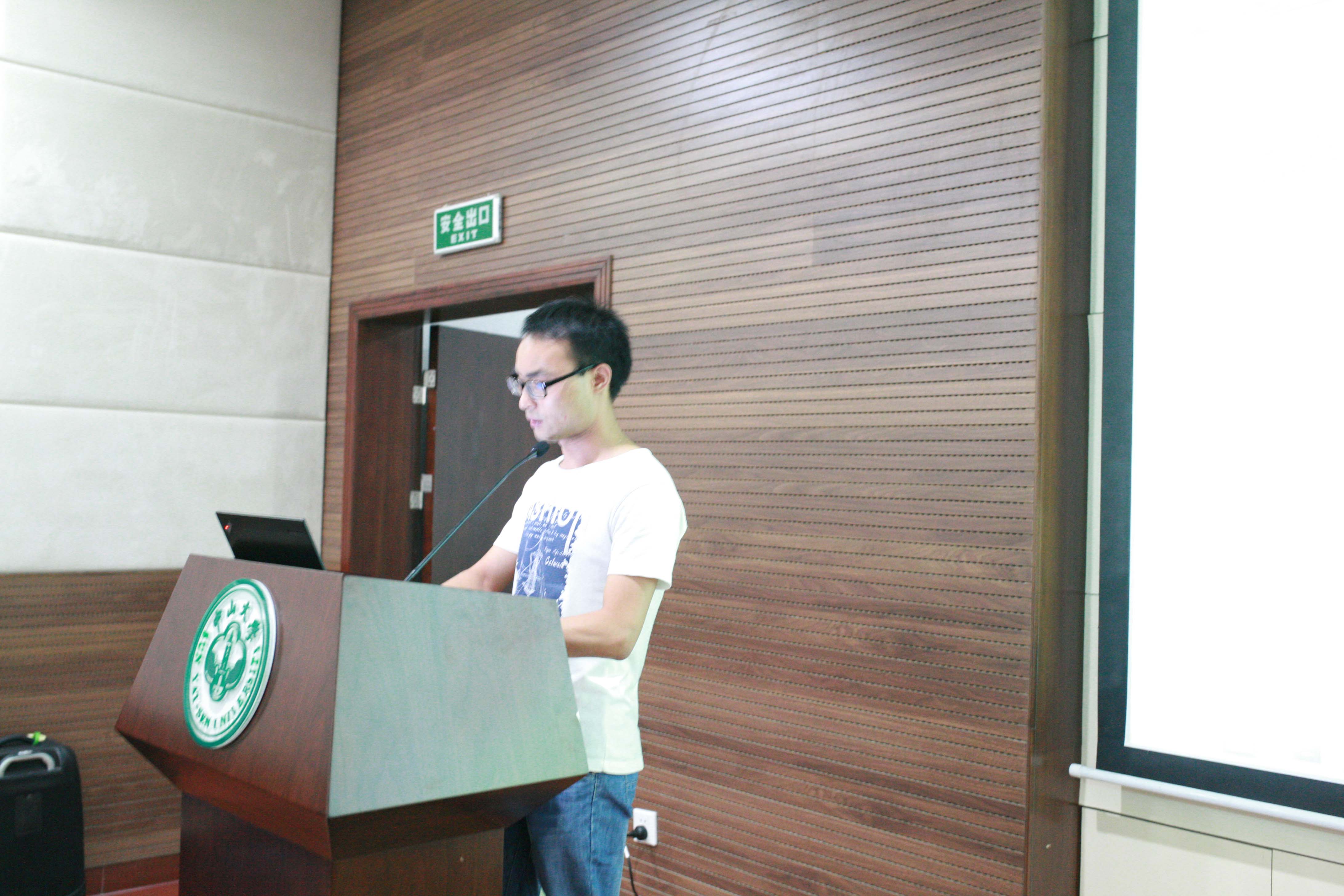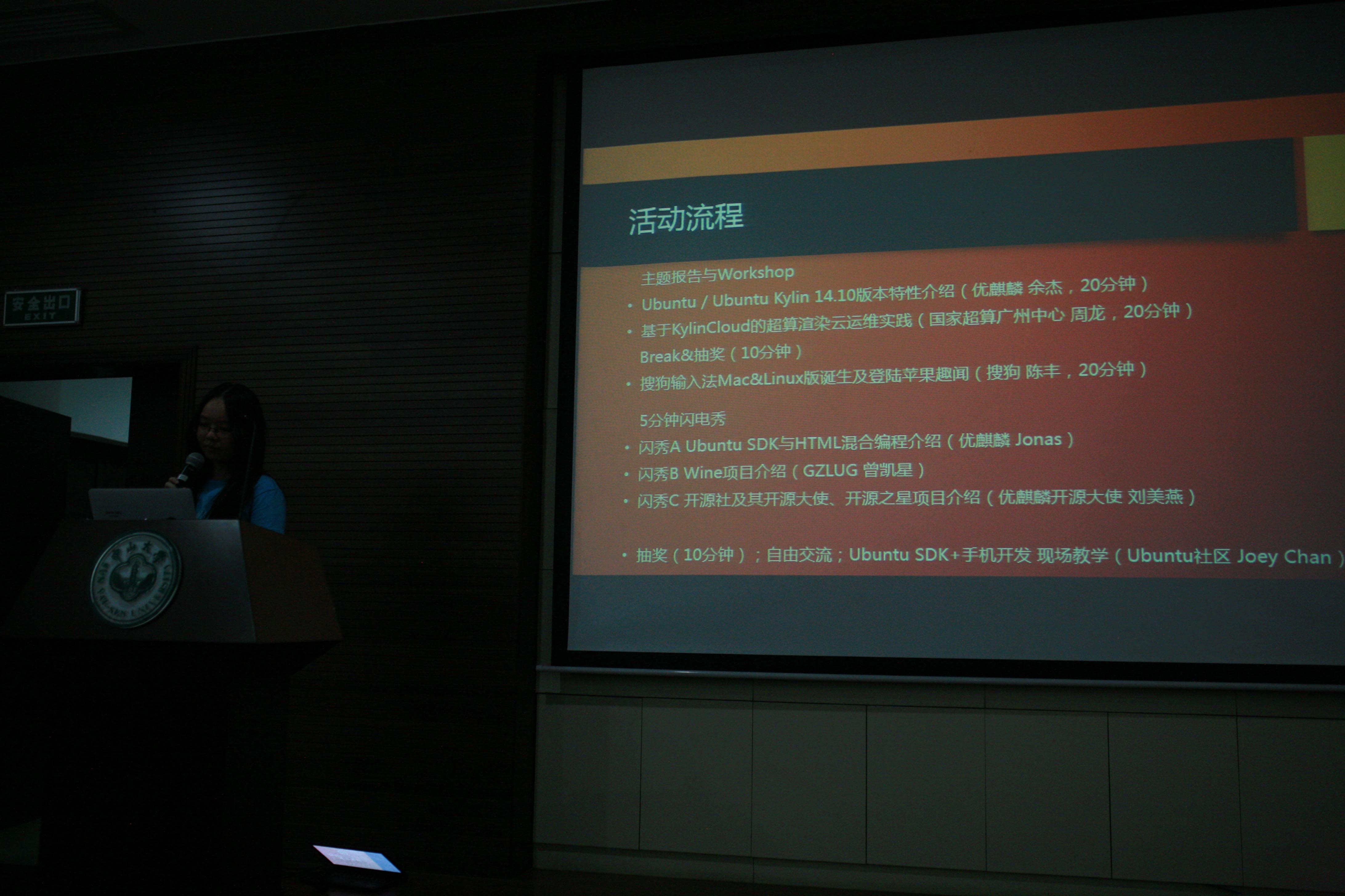 參觀結(jié)束,大家又一起返回了中山大學(xué)信息科學(xué)與技術(shù)學(xué)院講學(xué)廳進(jìn)行交流,由中山大學(xué)篤行工作室的萬千惠同學(xué)擔(dān)任主持。首先是精彩的主題報告環(huán)節(jié),來自優(yōu)麒麟的項目負(fù)責(zé)人Jack Yu按照慣例做了Ubuntu Kylin 14.10版本特性介紹;來自國家超算中心的周龍工程師詳細(xì)介紹了他所在團(tuán)隊基于天河二號進(jìn)行云渲染研究的工作和進(jìn)展;來自搜狗的產(chǎn)品經(jīng)理陳豐則與大家分享了搜狗輸入法開發(fā)過程中的種種趣聞,博得了在場觀眾的陣陣掌聲和笑語。緊接著是來自優(yōu)麒麟的Jonas、廣州Linux用戶組的Jactry(曾凱星)為大家奉獻(xiàn)了精彩5分鐘閃電秀,分別介紹了基于Qt/HTML5的混合編程技術(shù)和“黑科技:如何使Wine看 起來更原生”;來自優(yōu)麒麟的美女設(shè)計師張宇璐與在場的眾多程序員展開了有趣的“設(shè)計師與程序員”的對話,爆料了她在工作中與“沒底的瓶子”之間的那些事。 最后,優(yōu)麒麟開源大使劉美燕代表開源社向大家介紹最近成立的開源社區(qū)聯(lián)盟——開源社的宗旨及其開源之星和開源大使項目。
